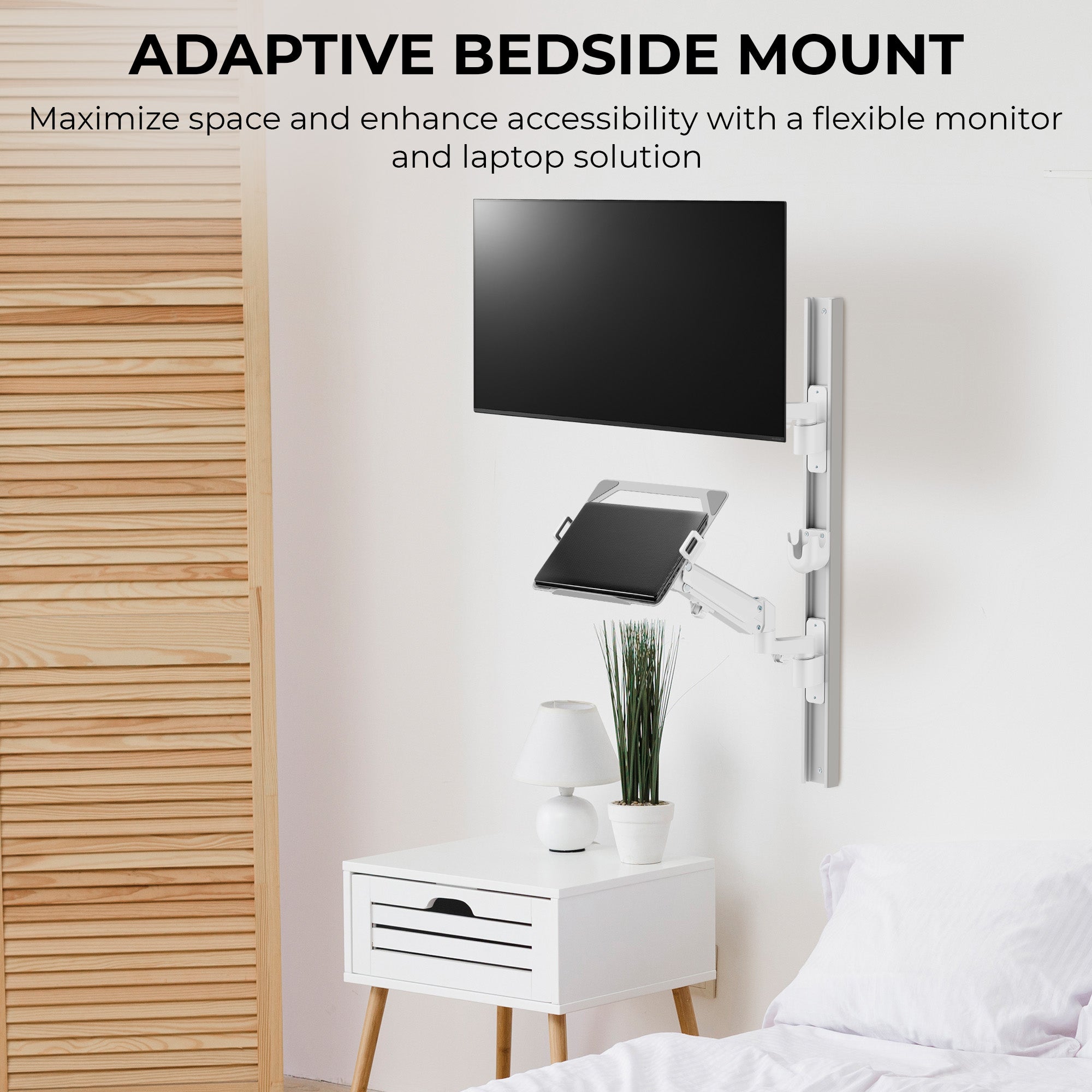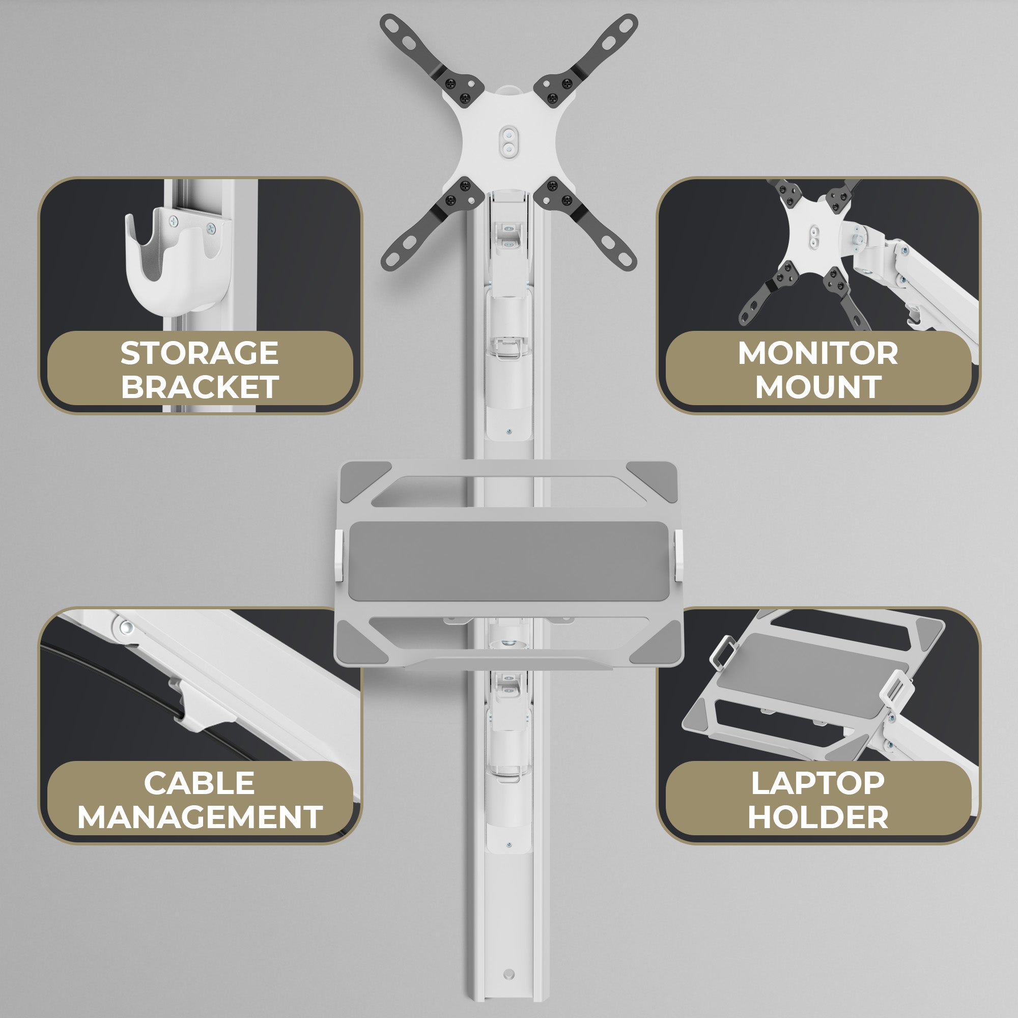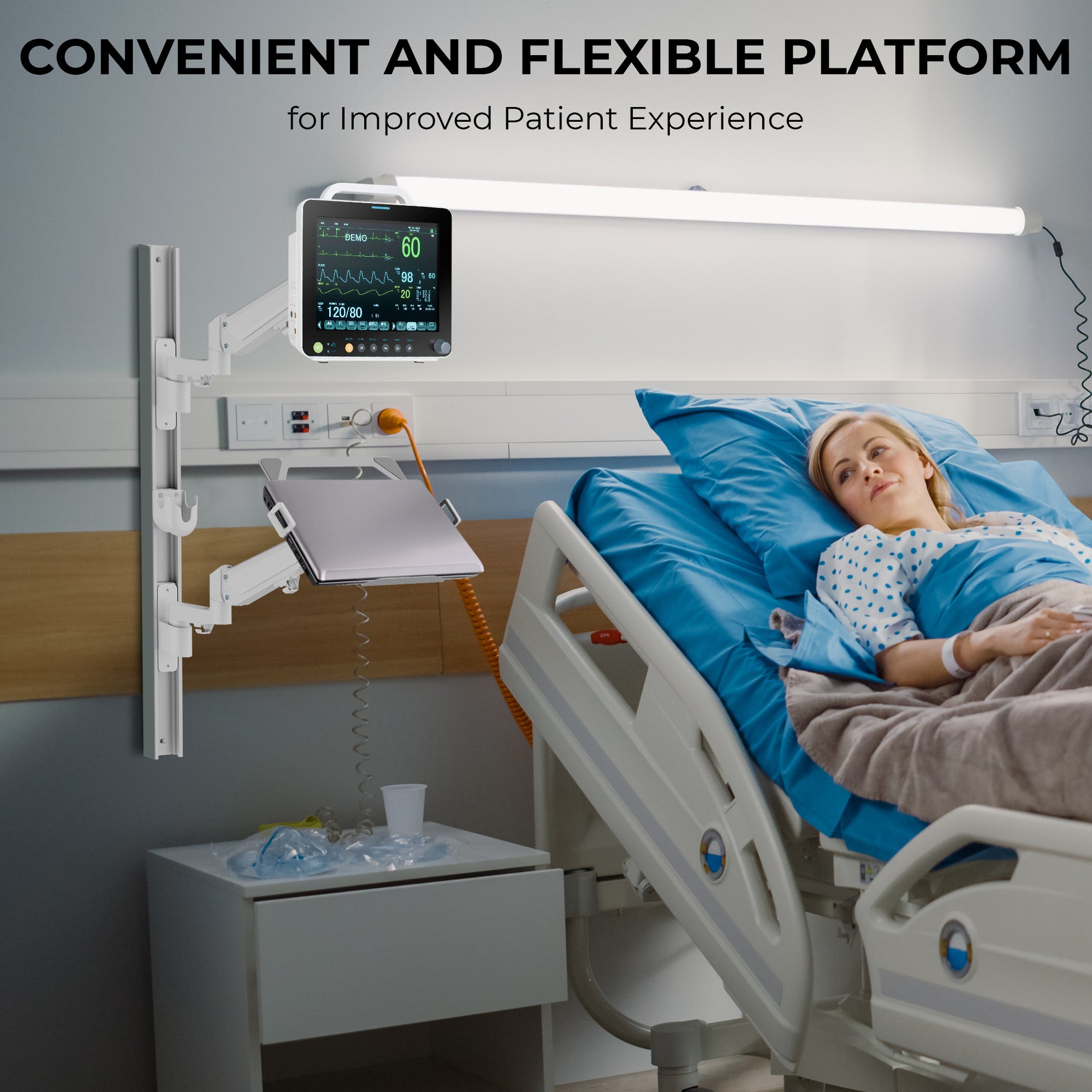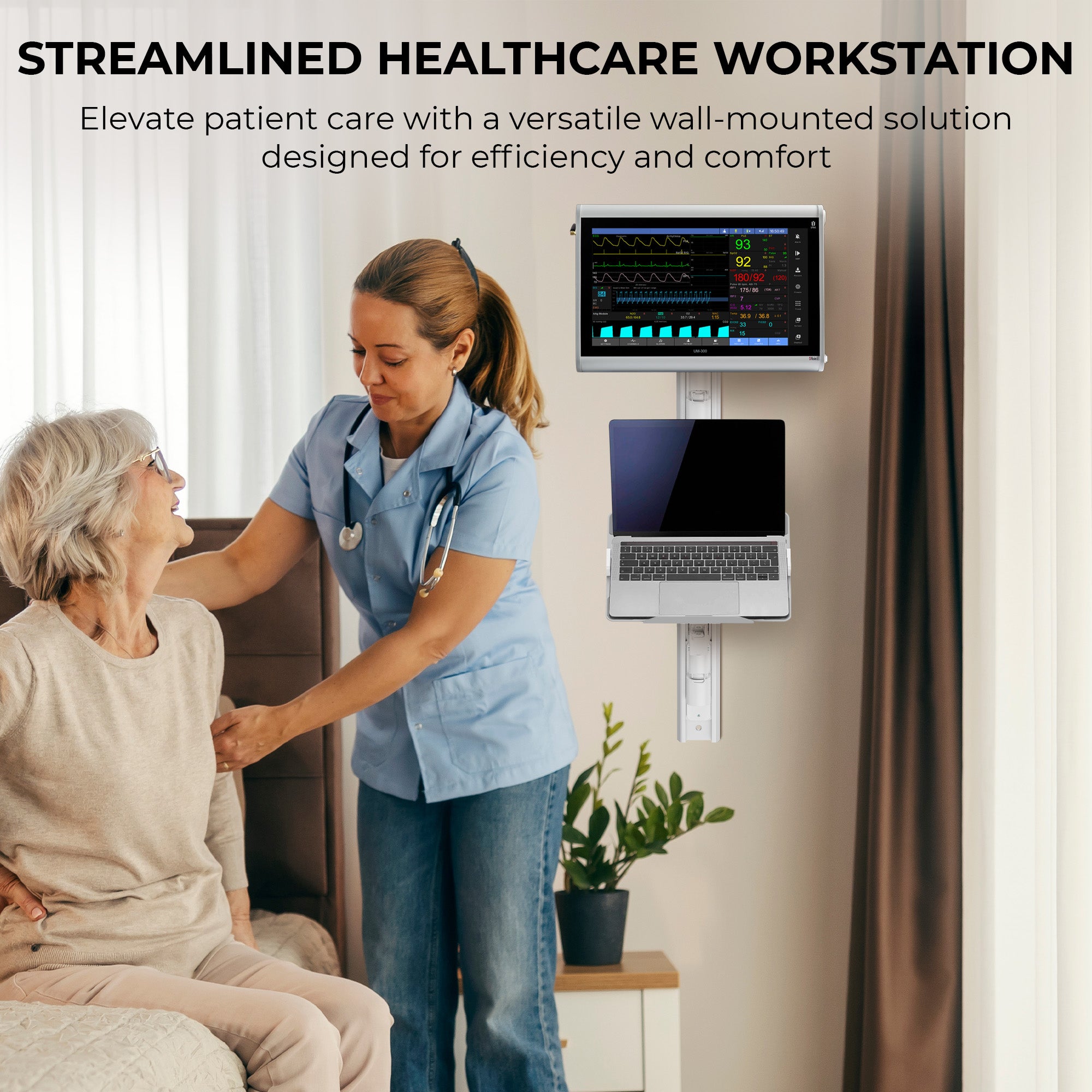 • Durable Wall Workstation – Heavy-duty VESA mount with keyboard tray built from steel-aluminum for daily clinical or office use. Supports up to 32" monitors with a clean, matte white finish.